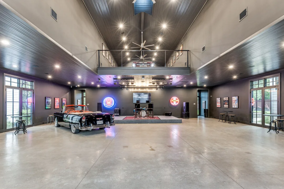 A two-story, modern area that provides plenty of space for entertainment and includes their love of automobiles.